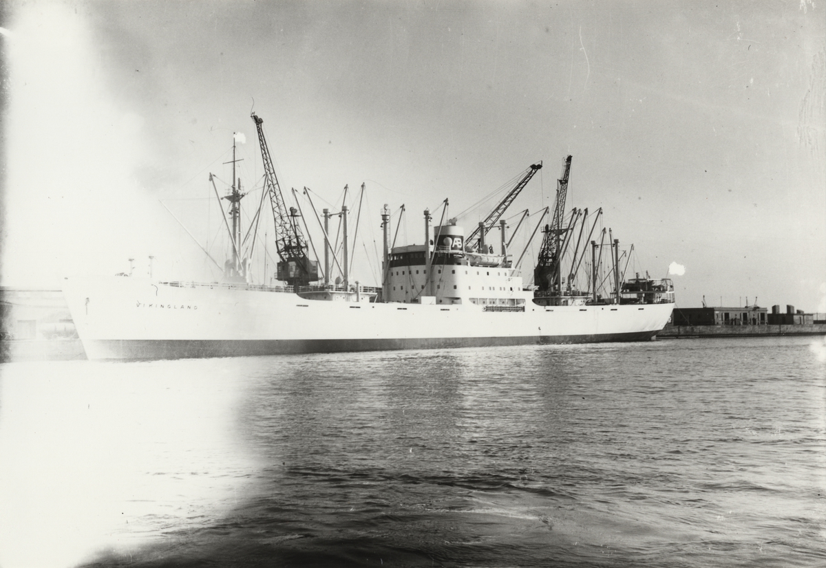 Foto i svartvitt visande lastmotorfartyget "VIKINGLAND" i Köpenhamn under 1950-talet.