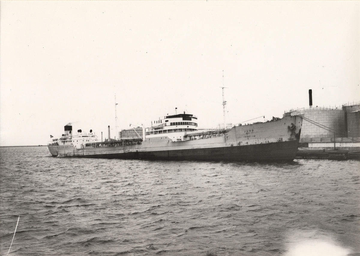 Foto i svartvitt visande tankmotorfartyget "JUNO" i Köpenhamn under år 1955.