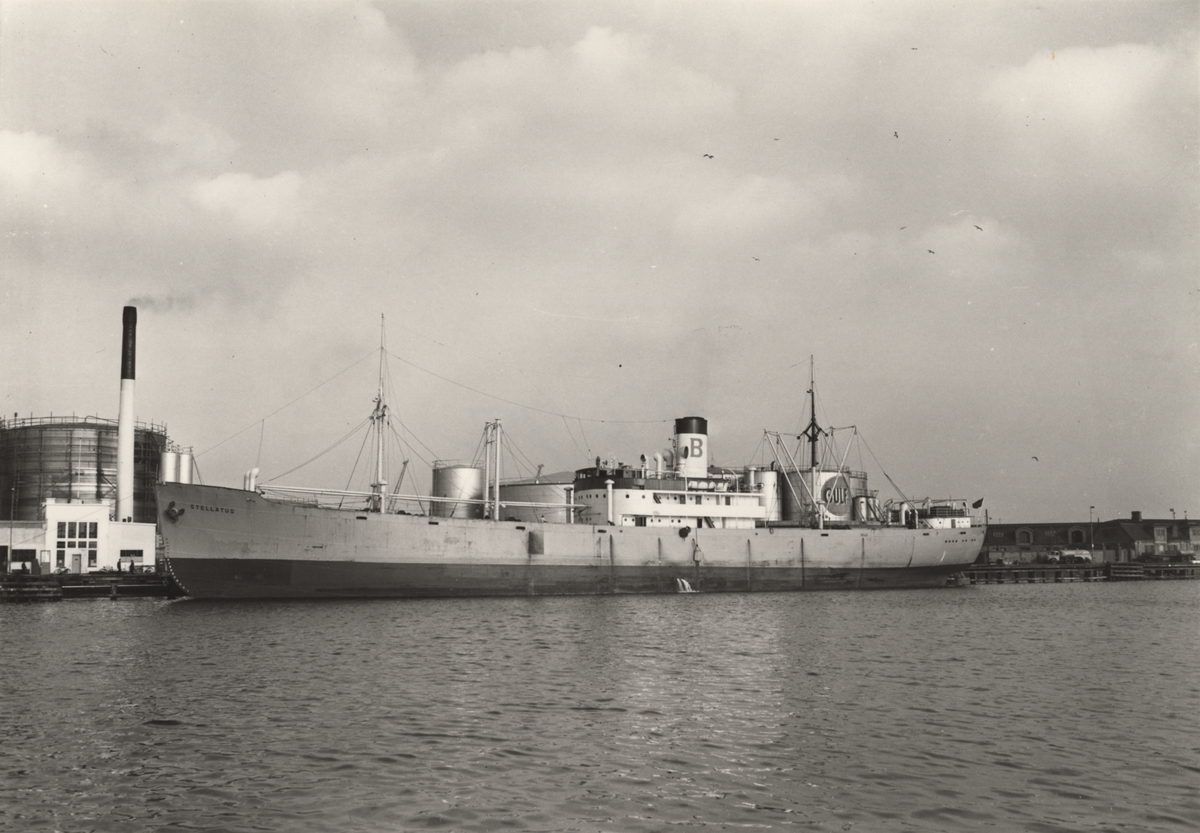 Foto i svartvitt visande lastångfartyget "STELLATUS" i Köpenhamn under år 1955.
