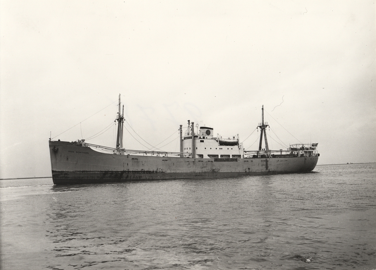 Foto isvartvitt visande lastmotorfartyget "IVAN GORTHON" i Köpenhamn under år 1955.