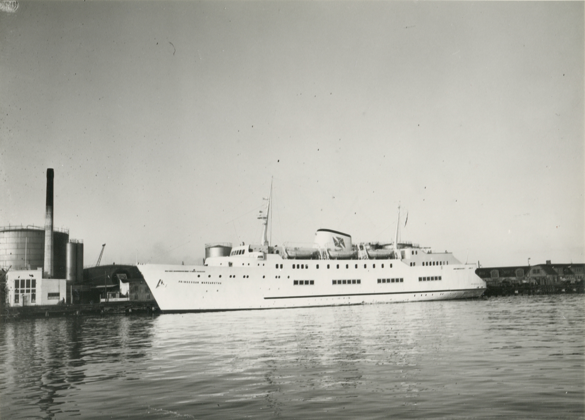 Foto i svartvitt visande bil & passagerarmotorfärjan Prinsessan Margaretha i Köpenhamn under april månad 1955.