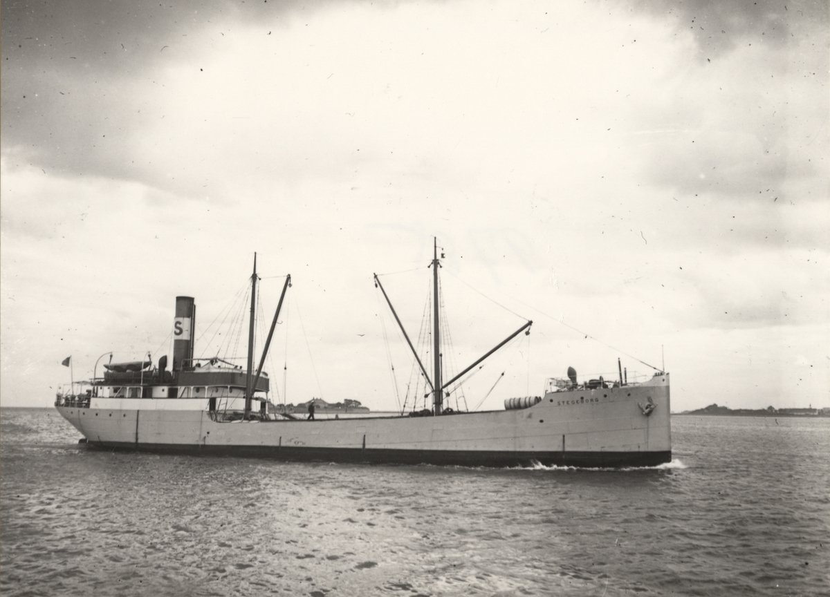 Foto i svartvitt visande lastångfartyget "STEGEBORG" i Köpenhamn.