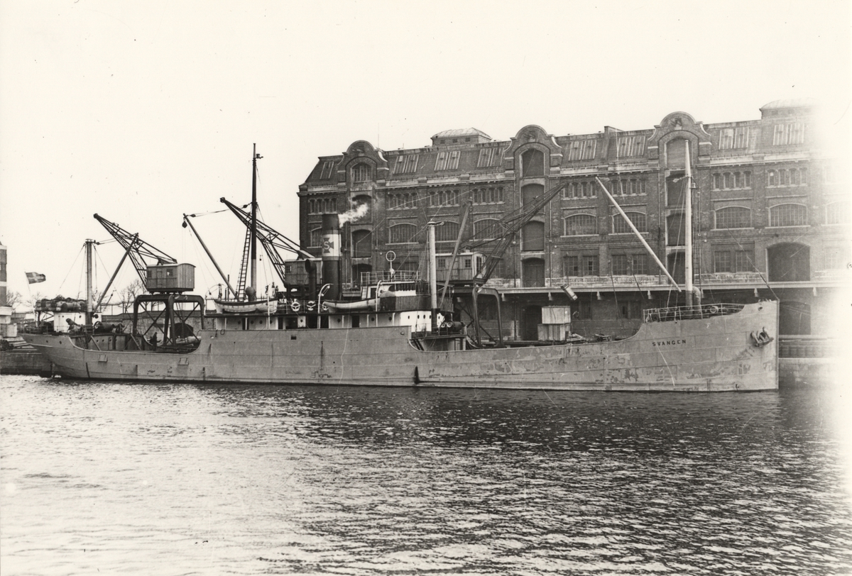 Foto i svartvitt visande lastångfartyget "SVANGEN" i Köpenhamn.