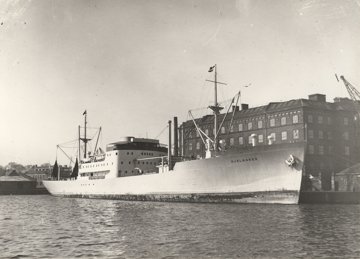 Foto i svartvitt visande lastmotorfartyget "HJELMAREN" vid kaj i Köpenhamn.