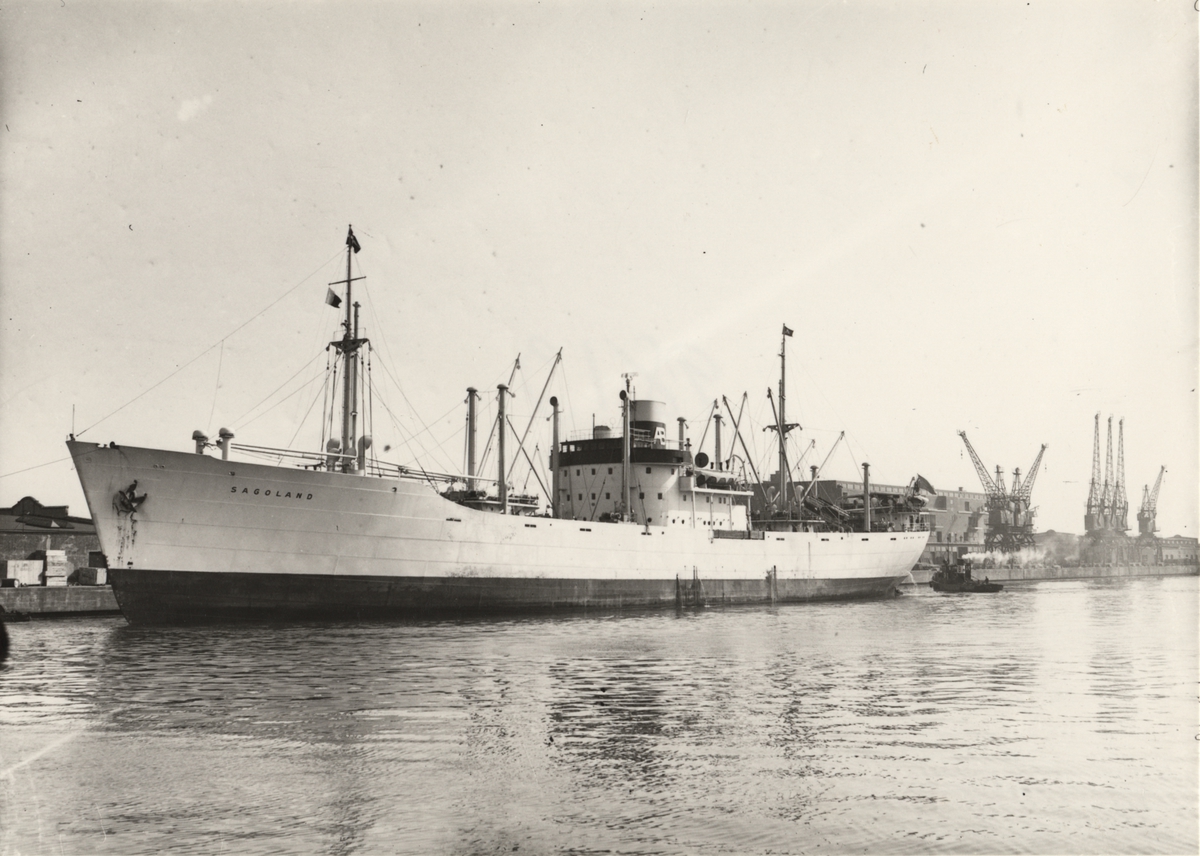 Foto i svartvitt visande lastmotorfartyget "SAGOLAND" vid kaj i Köpenhamn.