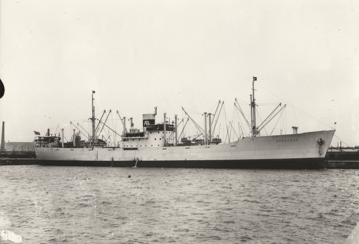 Foto i svartvitt visande lastmotorfartyget "SAGOLAND" vid kaj i Köpenhamn.