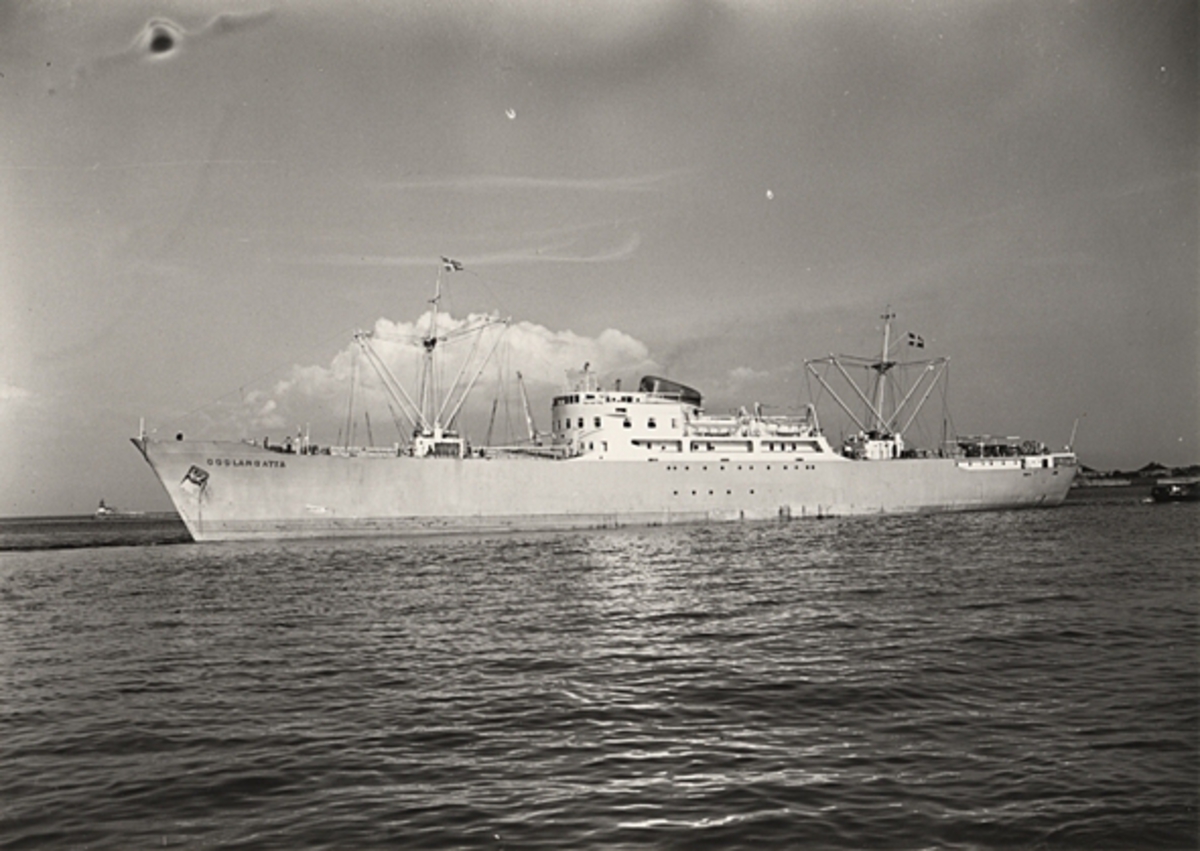 Foto i svartvitt visande lastmotorfartyget "COOLANGATTA" i Köpenhamn under år 1954.