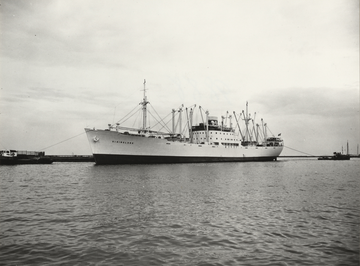 Titel: Foto i svartvitt visande lastmotorfartyget "VIKINGLAND" i Köpenhamn under år 1954.