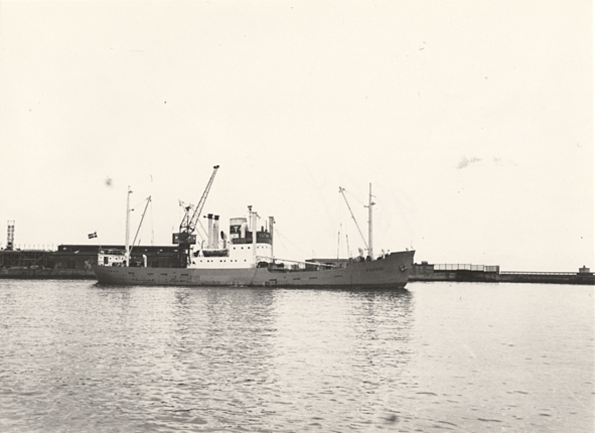 Foto i svartvitt visande lastmotorfartyget "FROSTE" i Köpenhamn under år 1954.