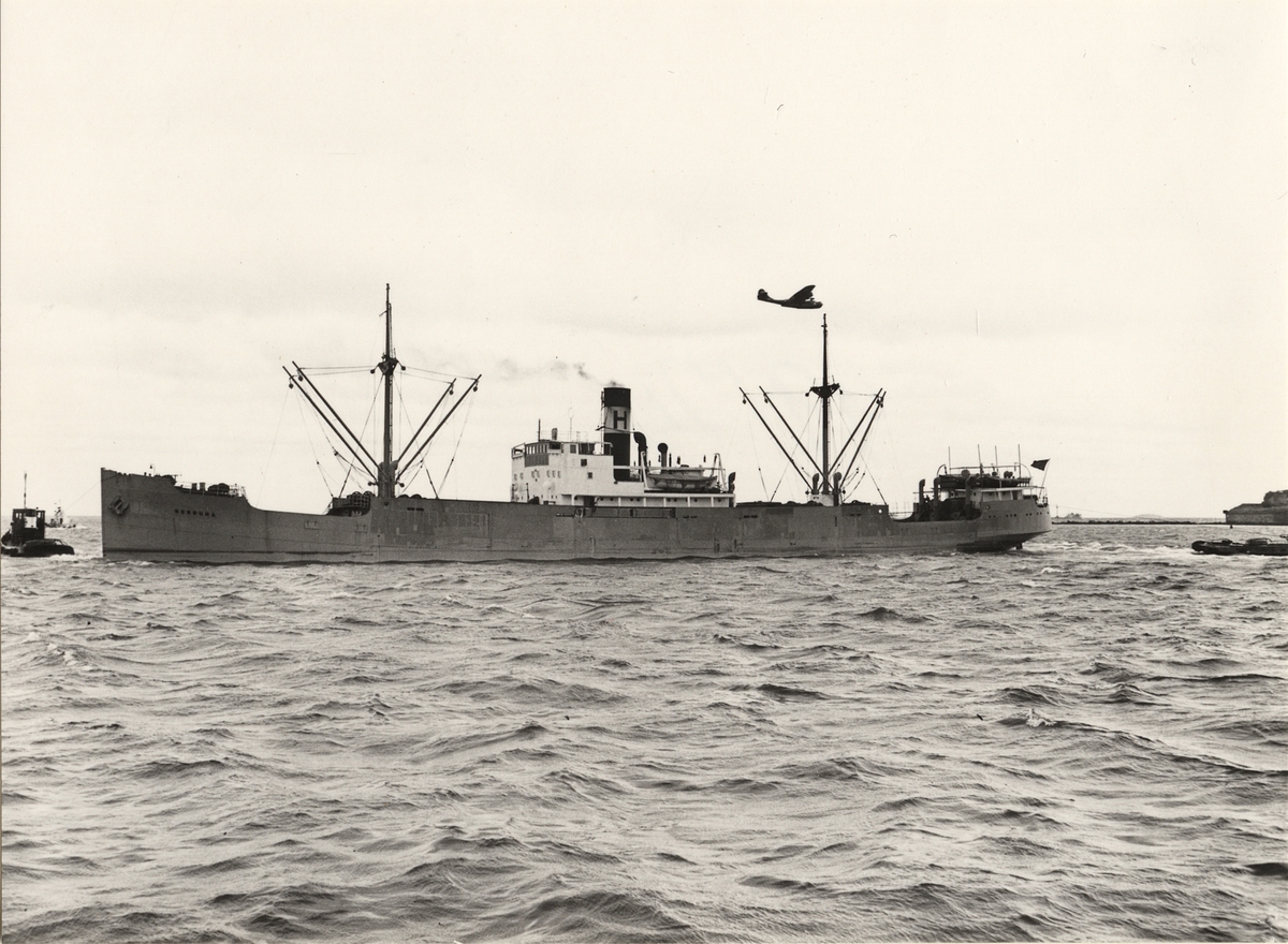 Foto i svartvitt visande lastångfartyget "NORRUNA" i Köpenhamn någon gång under år 1954.