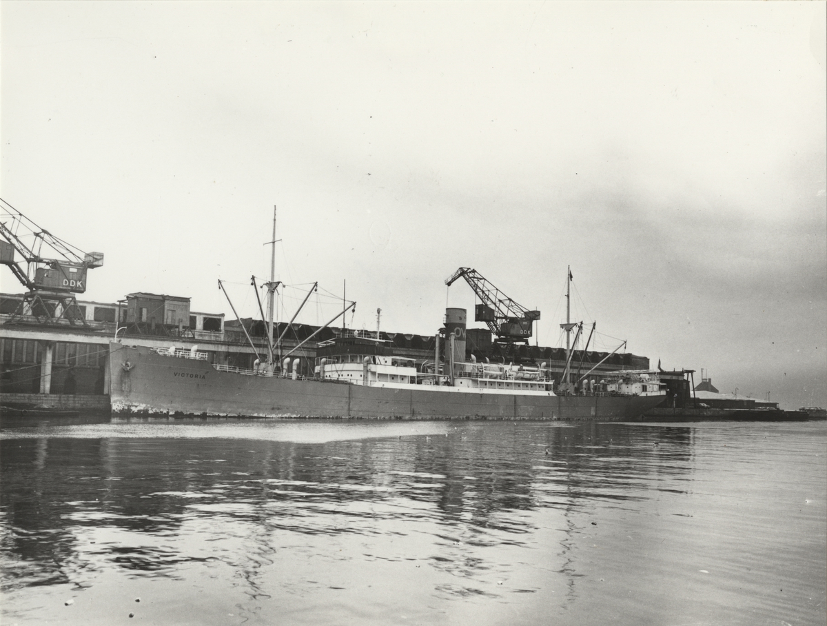 Foto i svartvitt visande lastmotorfartyget "VICTORIA" i Köpenghamn under december månad 1954.