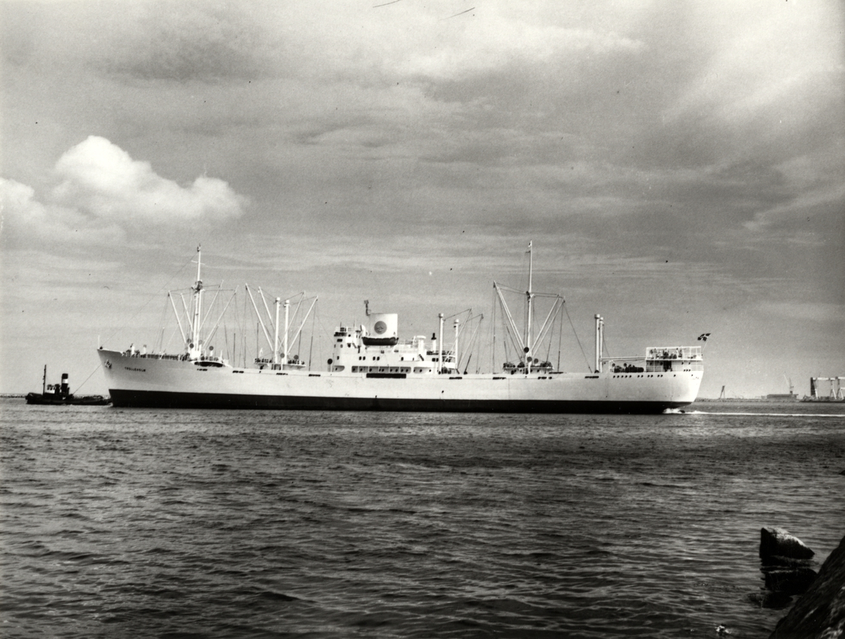Foto i svartvitt visande lastmotorfartyget "TROLLEHOLM" i Köpenhamn under år 1954.