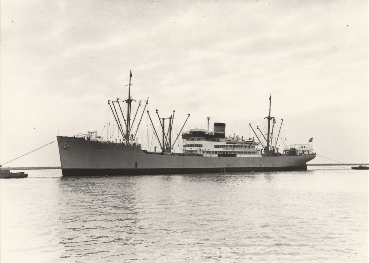 Foto i svartvitt visande lastmotorfartyget "SUECIA" i Köpenhamn.