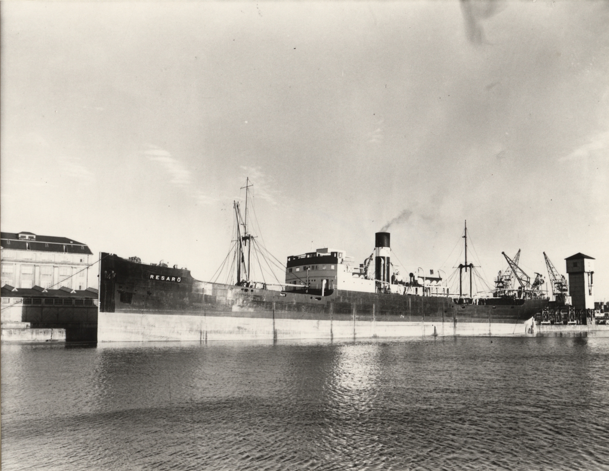 Foto i svartvitt visande lastångfartyget "RESARÖ" i Köpenhamn under augusti månad 1953.