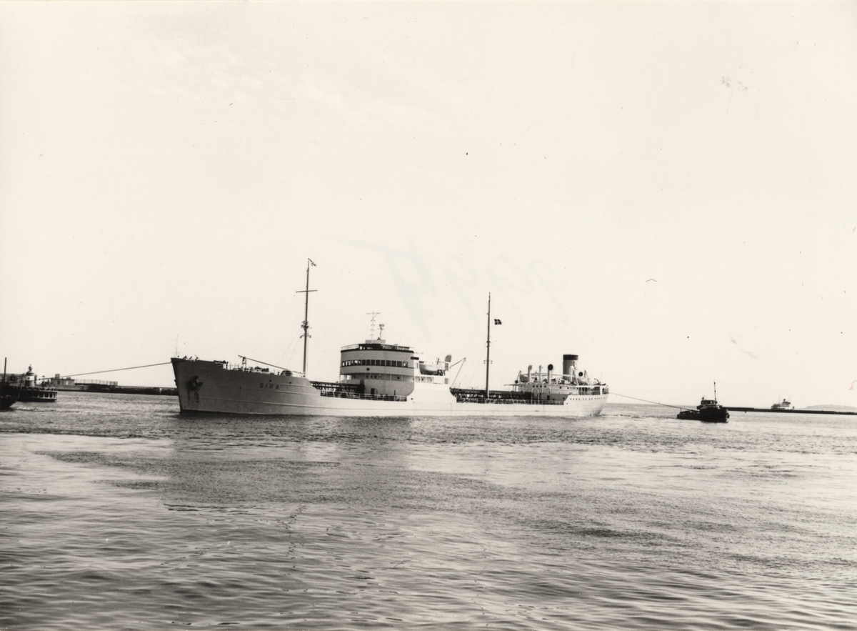 Foto i svartvitt visande tankmotorfartyget "SIRA" i Köpenhamn under juli månad år 1958.