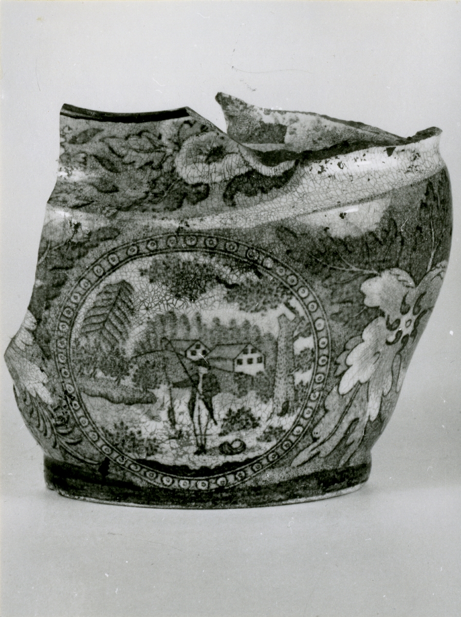 Gräddkanna av porslin med dekor i blått: Blommor och blad samt en medaljong med en metare. RÖRSTRAND inpressat på fotringen och tryckt elefant på botten. Höjd 8 cm. Diameter 5 cm. Pip och handtag samt en del av kärlkroppen avslaget.