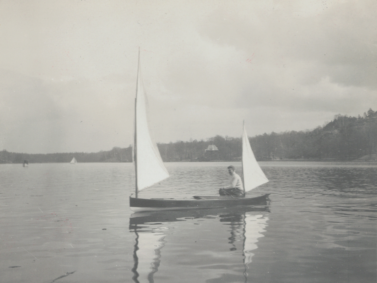 Richard Hansson i segelkanoten Runi på Djurgårdsbrunnsviken, Stockholm. I bakgrunden Sirishov.