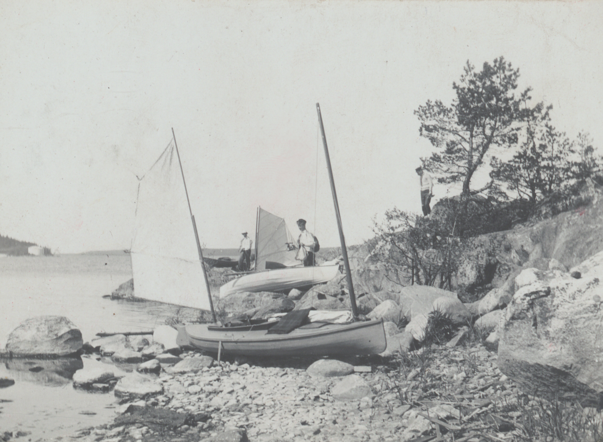 Segelkanoter, bl a Gerhard Högborgs "Solstrålen", uppdragna på en skärgårdsholme.