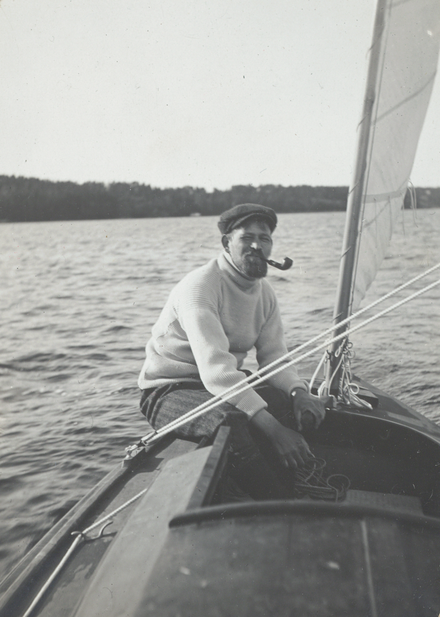 Kanotseglare, ev. Erik "Boa" Boström, rökandes pipa i sittbrunnen på segelkanot.
