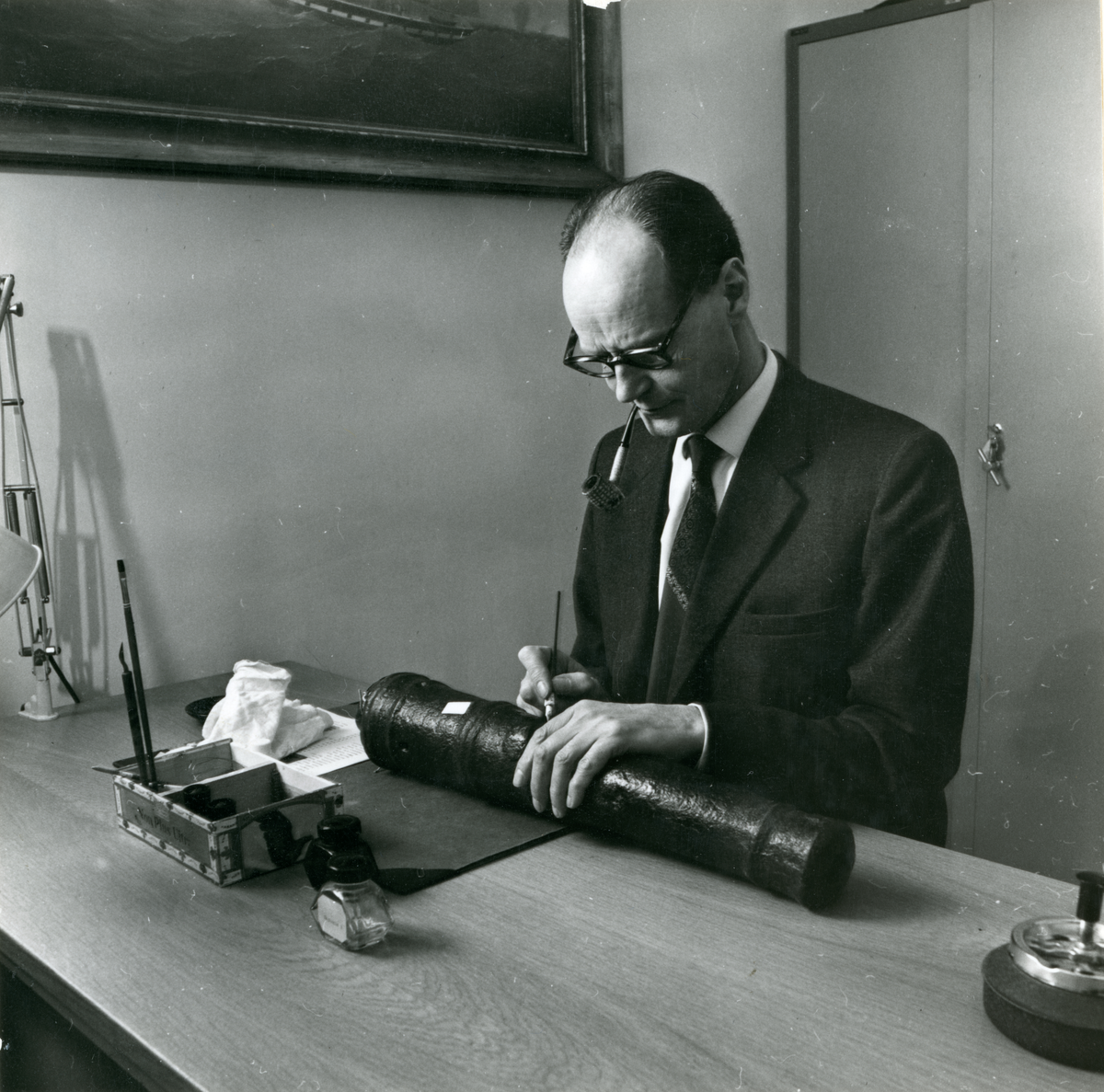 Föremålsregistrering - en salutkanon märks. Sven Hårleman i arbete.
