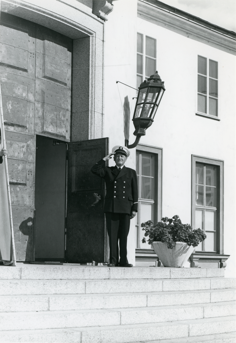Vaktmästare/museivakt Adrian Karlsson gör honnör på Sjöhistoriska museets trappa. Ur dokumentation av personalfotografier, SSHM.