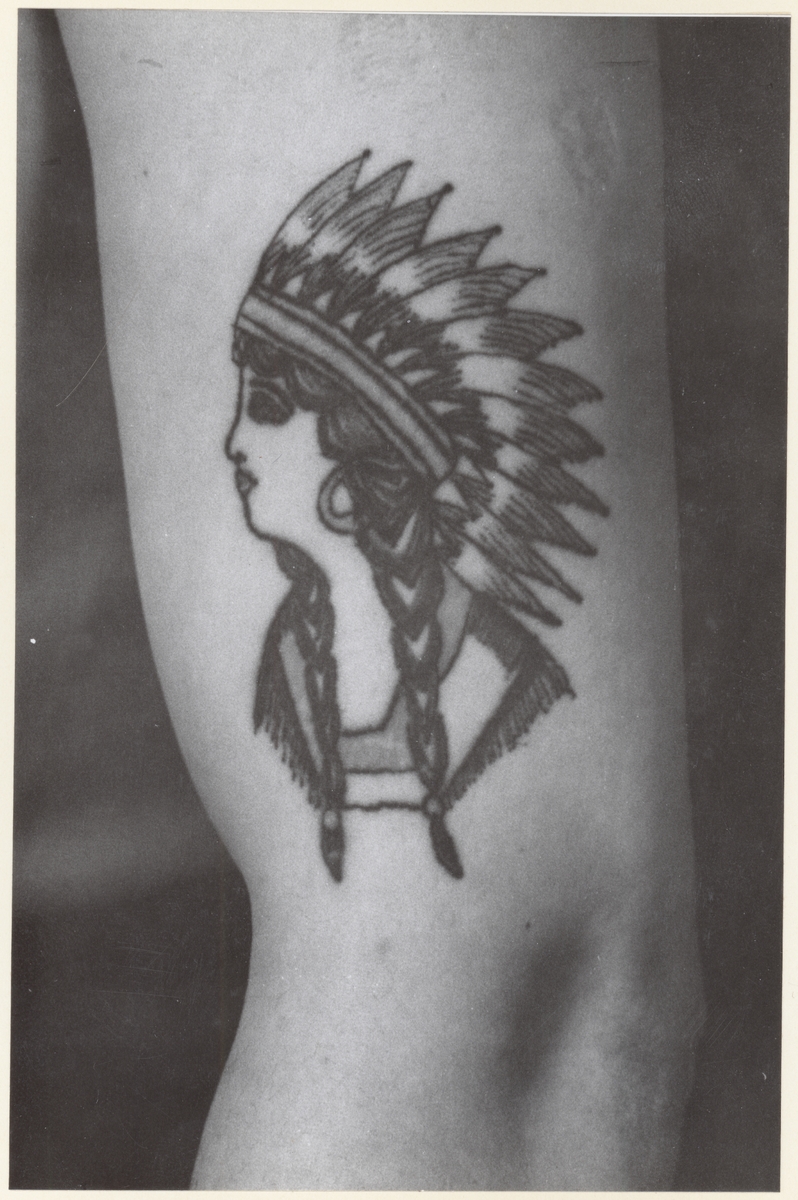 Tatuering på armen av indianhuvud, röd och blå. Utfört av en sjöman i Karlshamn, 1942 utan betalning.