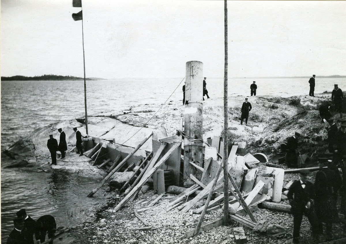 Målanordningarna (efter skjutningen) på L. Äggskäret vid flottans första skjutning med brisansladdade spränggranater från Oscar II, våren 1914.