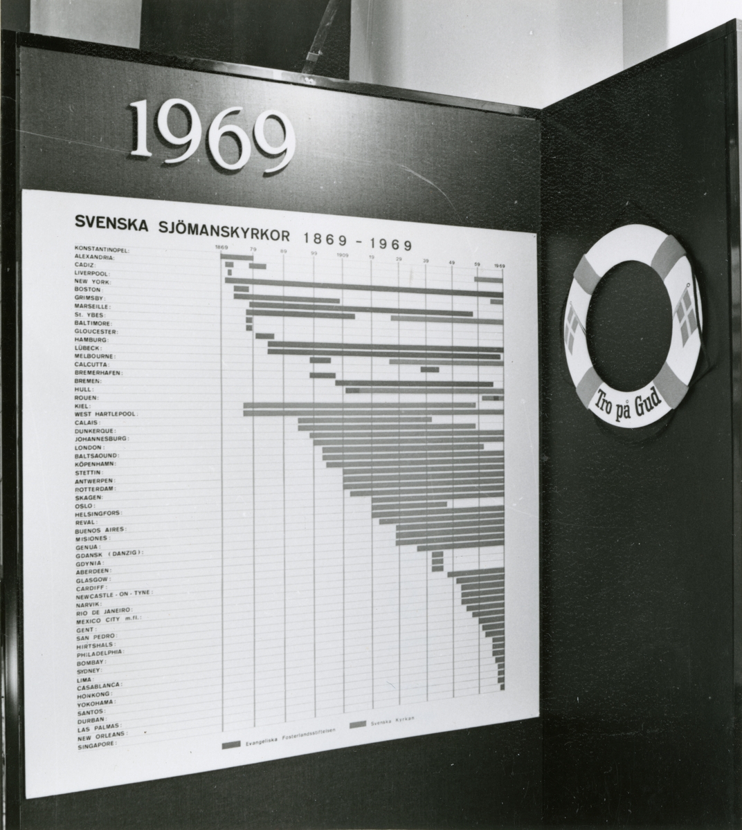 Utställningen "Ute men hemma Svenska sjömanskyrkan 100 år". Diagram över antalet svenska sjömanskyrkor 1869-1969.