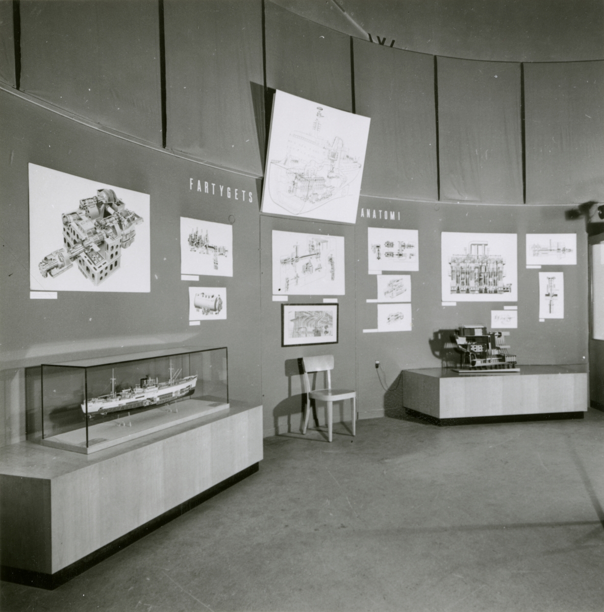 Utställningen "Fartygets anatomi". Inledningsmonter med ritningar och fartygsmodeller.