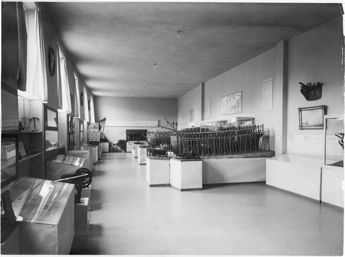 Tillfällig utställning vid museets öppnande 1938 i Chapmansalen. Fartygsmodell i monter.