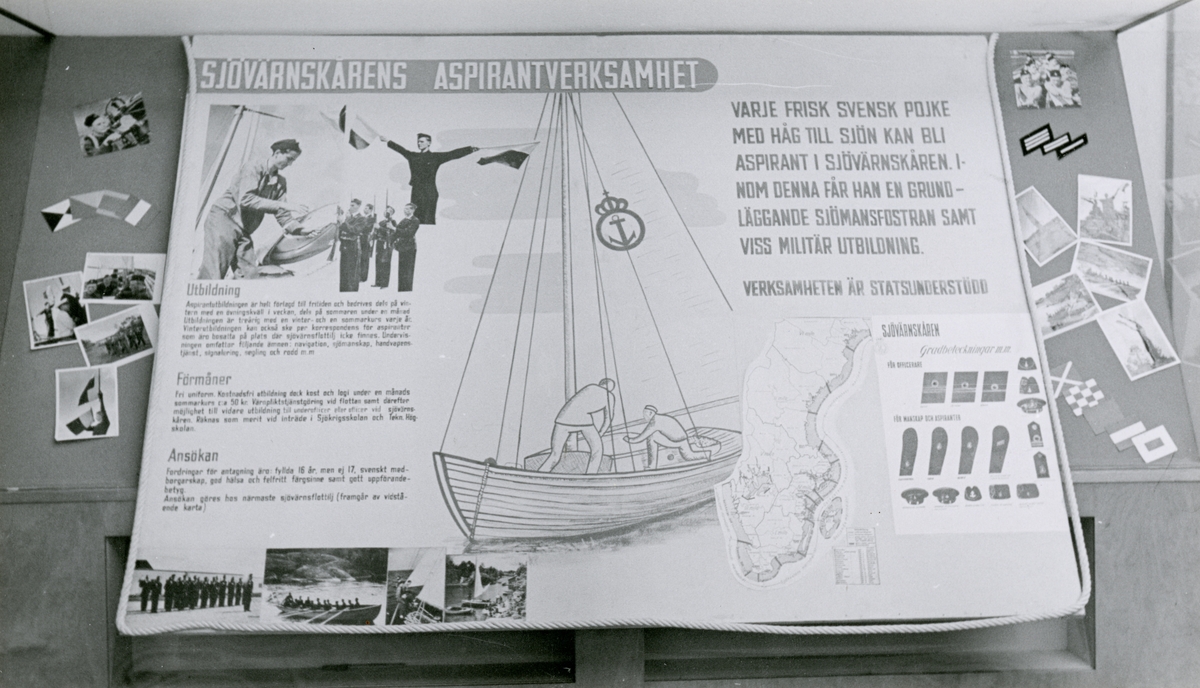 Tillfälliga utställningen Moderna rederisalen. Skärmutställning "Sjövärnskårens aspirantverksamhet".