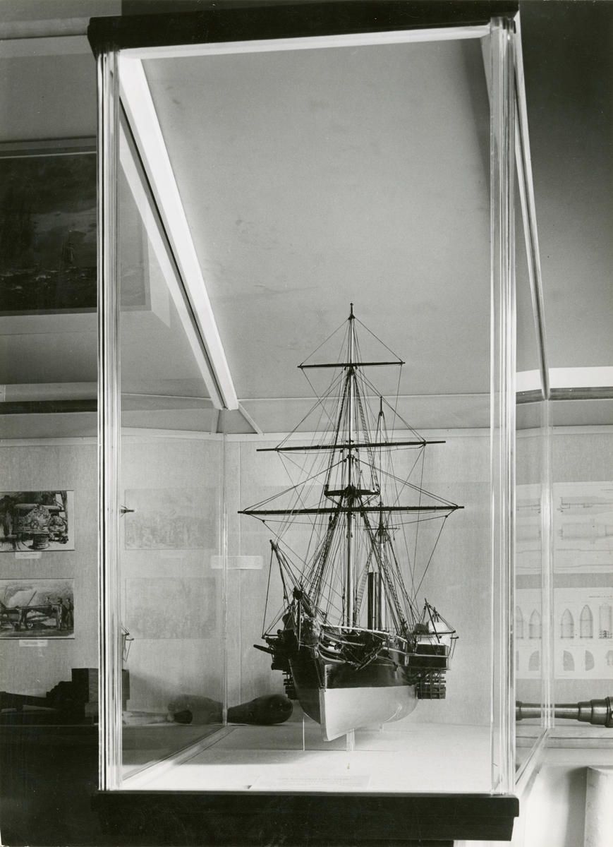 Utställning i rum 7 i Örlogsavdelningen. Fartygsmodell av ångkorvetten THOR.