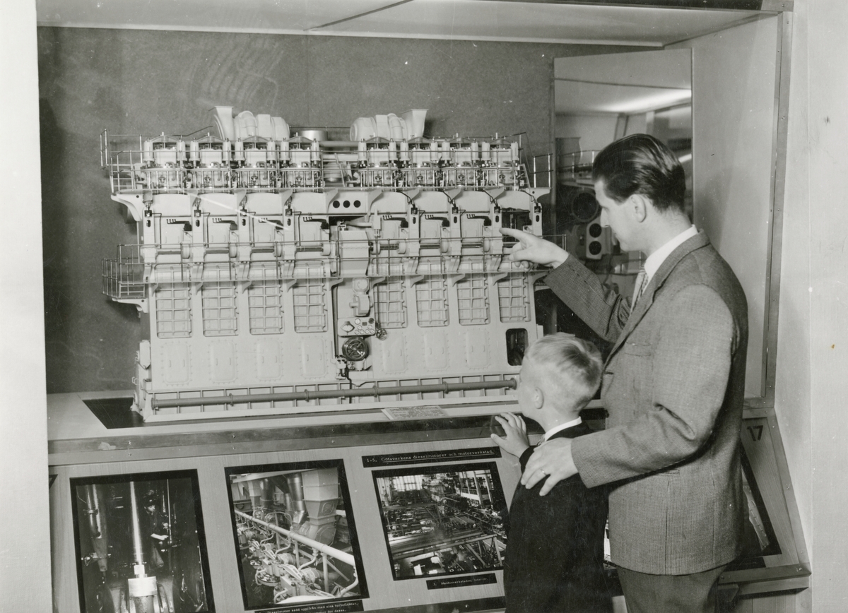 Varvsutställningen, rum 7. En man och en pojke studerar en modell av 8-cylindrig turbodiselmotor av Götaverkets konstruktion i skala 1:10.
