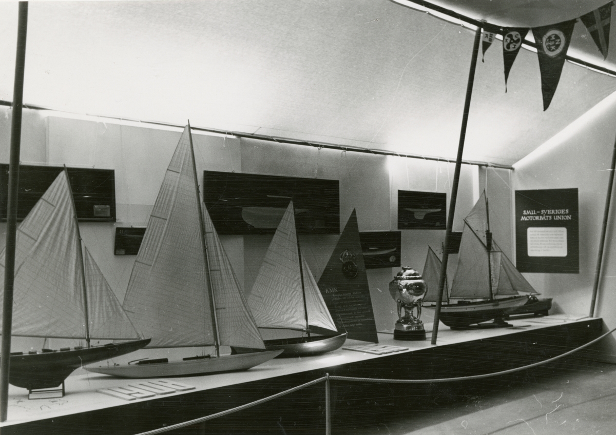 Tillfälliga utställningen, Sjösportsutställningen i källarvåningen. Monter med fartygsmodeller om fritidsbåtar och klubbarna KSSS (Kungliga Svenska Segel Sällskapet) samt SMAL (Sveriges motorbåts union).