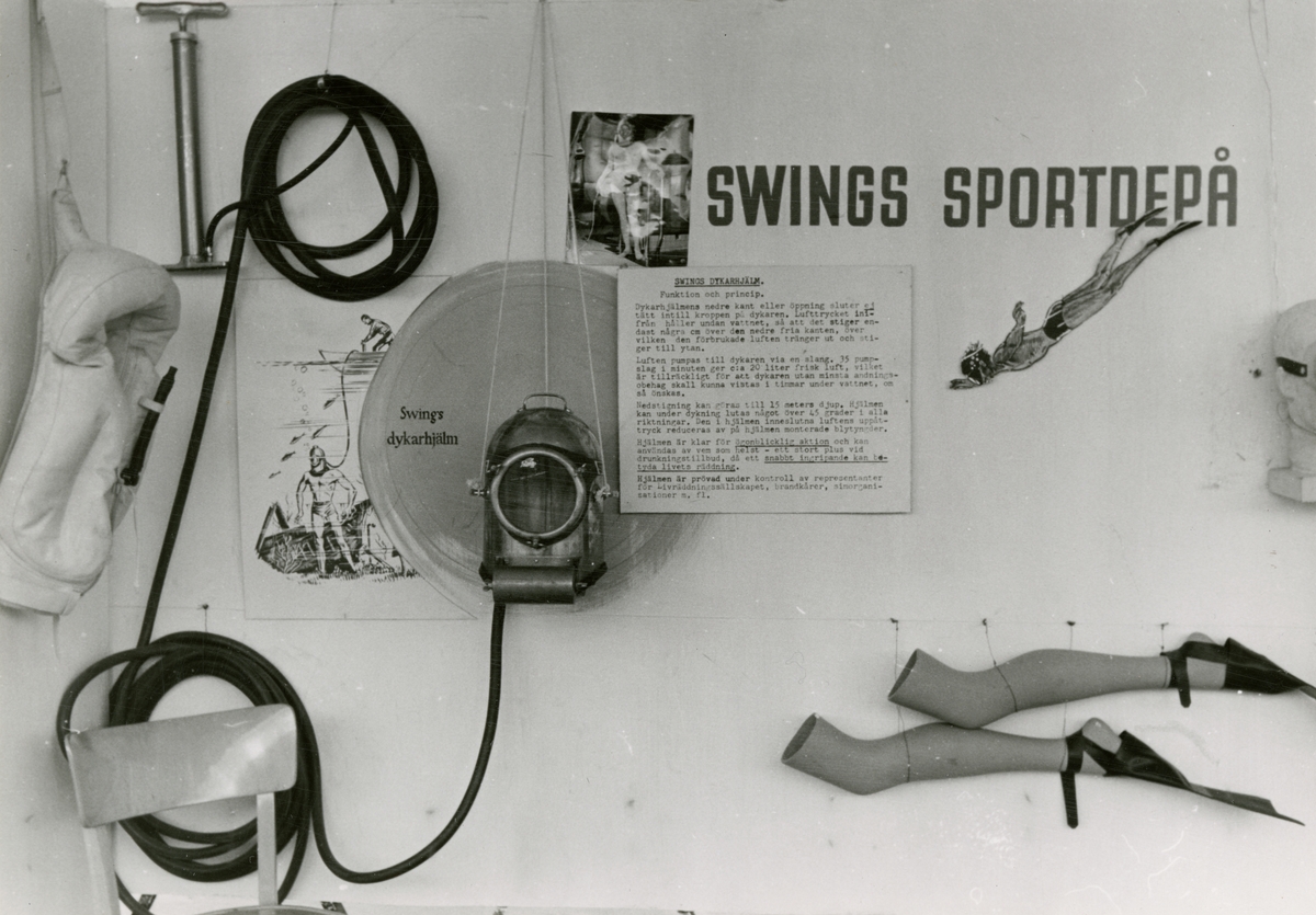 Tillfälliga utställningen, Sjösportsutställningen i källarvåningen. Monter om "Swings sportdepå" med utrustning för sportdykeri.