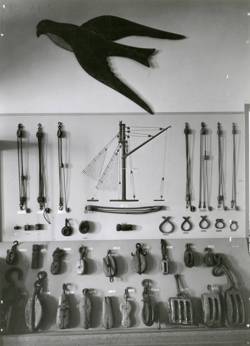 Sjöfartsutställningen, rum 6. Presentation av äldre block och taljor.