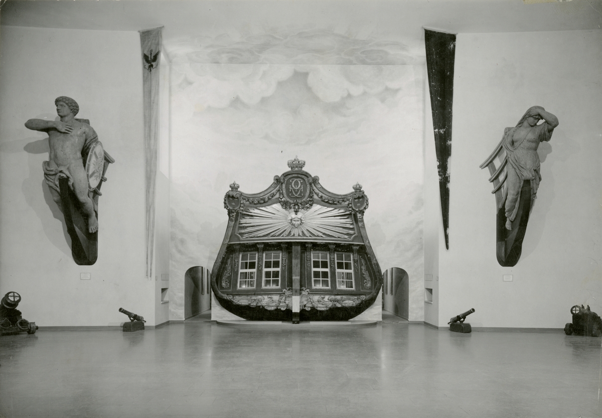 Utställning i Minneshallen. AMPHIONS akterspegel flankerad av galjonsfigurer.