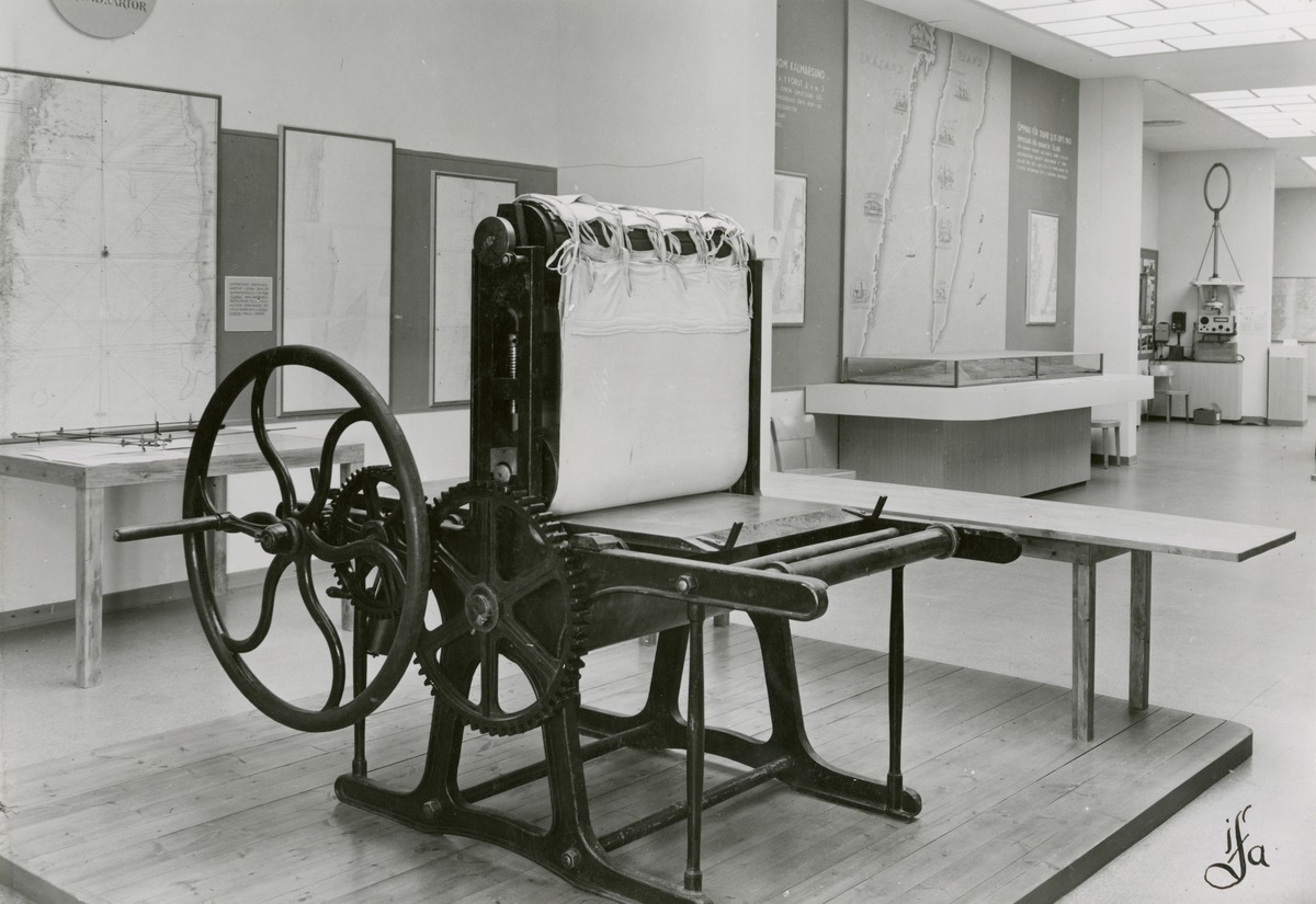 Utställningen "Sveriges sjökarta 16441944". Tryckpress från 1800-talet samt kartor.