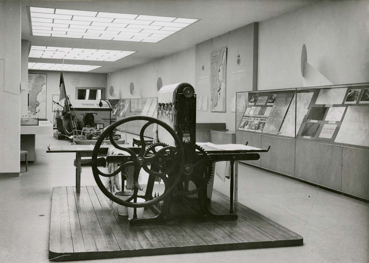 Utställningen "Sveriges sjökarta 16441944". Avdelning 3, sal 5, från söder med tryckpress från 1800-talet.