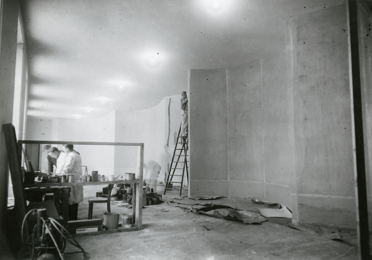 Utställningen "Stockholms Rederi AB Svea". Personal som arbetar med uppmonteringen.