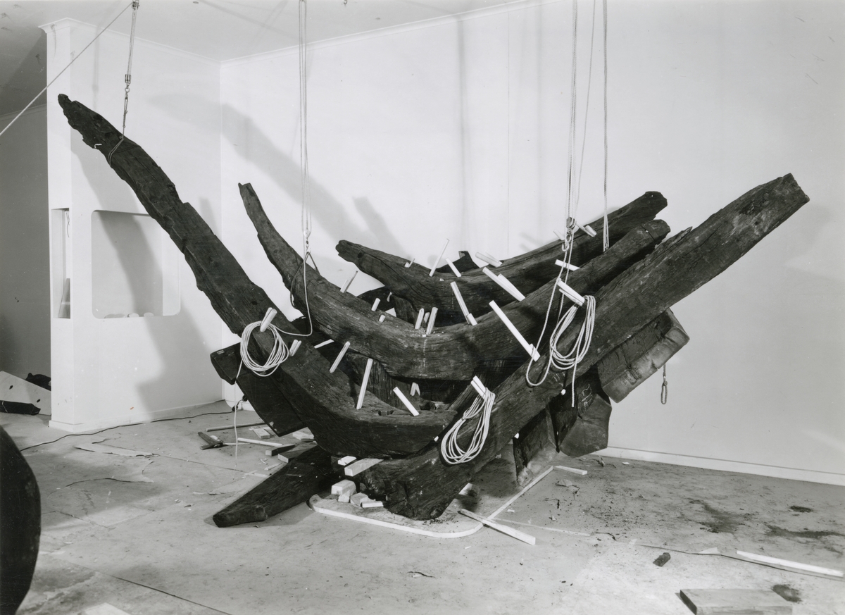 Varvsutställningen. Provuppsättning av vrakdelar i den blivande Skeppsbyggaravdelningen i södra valvet.