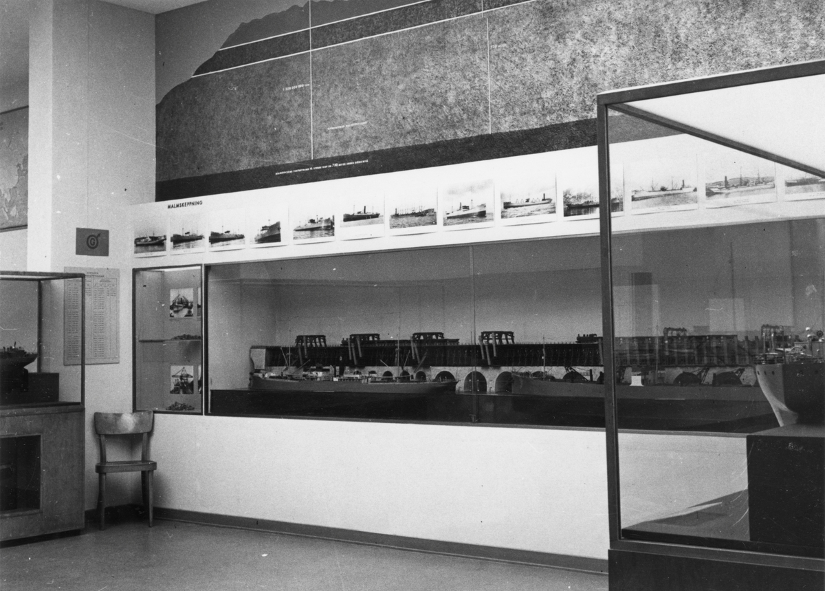 Utställning i Moderna avdelningen i Sjöfartsavdelningen. Fartygsmodeller i montrar.