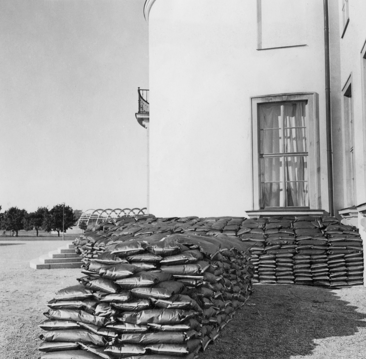 Luftskyddsåtgärder utanför Sjöhistoriska museet. Fyllda sandsäckar på sina platser utanför museet.