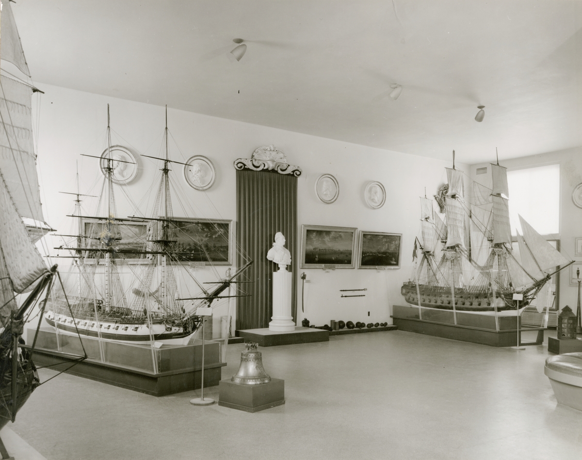 Utställning i Gustavianska salen, rum 3, i Örlogsavdelningen, norra väggen. Byst av Gustav III, modeller av fregatten BELLONA och linjeskeppet KRONPRINS GUSTAF ADOLF m.m.