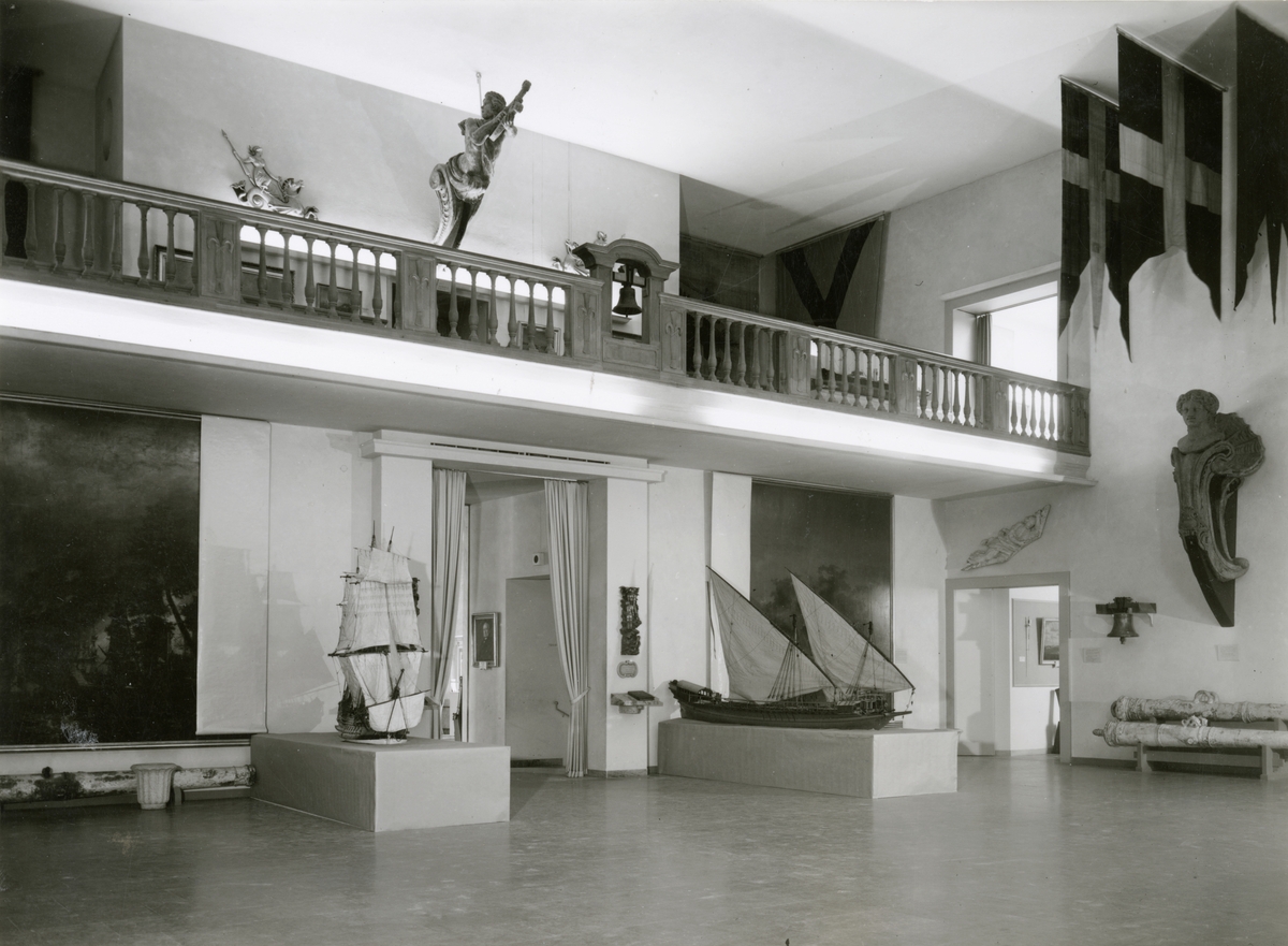 Provutställning i Minneshallen med läktaren och en galjonsfigur från AMPHION. På väggen under flaggorna galjonsfigur från fregatten THETIS.