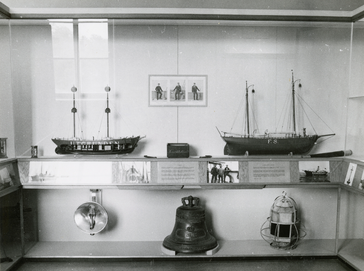 Utställningen "Fyr- och lotsväsende". Monter med fyrbåtar, skeppsklocka, fotografier m.m.