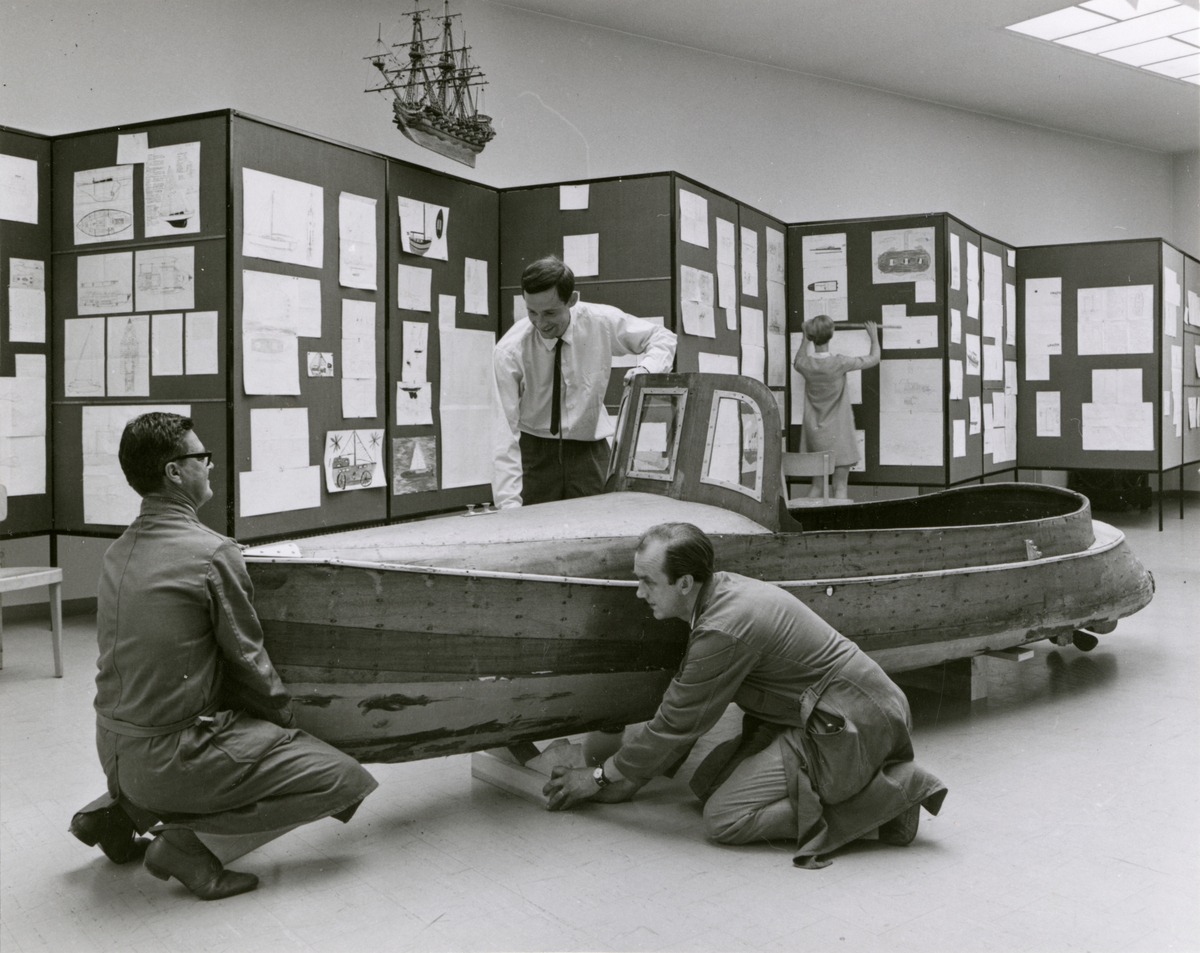 Utställningen "Framtidens nöjesbåt". Montering av motorbåten DIXIE till utställningen.