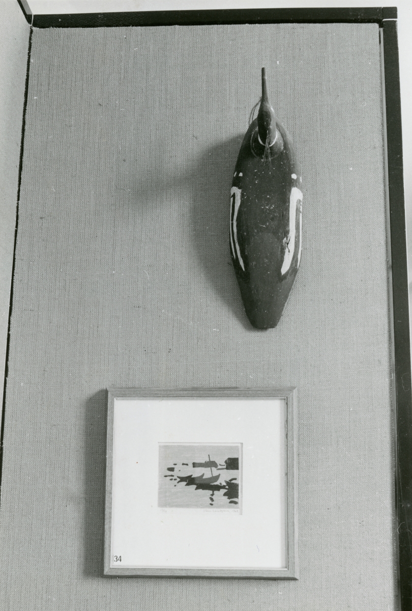 Utställningen "Sture Lundgren, segelgaleasen Blå Jungfrun". Akvareller, grafik och teckningar. Utställningsinteriör visande ett konstverk samt en vette (attrapp av trä som används vid jakt på sjöfågel).