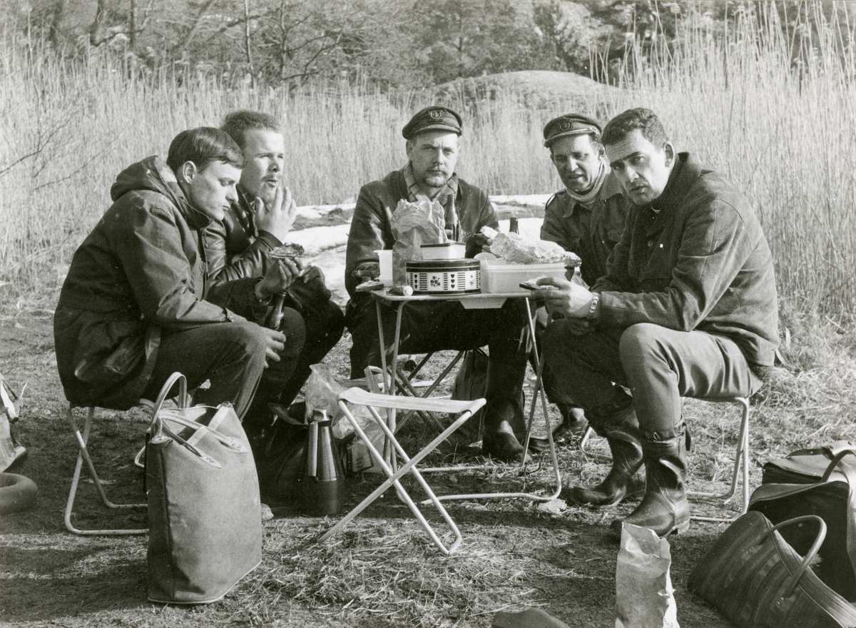 Matpaus under marinarkeologiska undersökningar vid Djurhamn. Från vänster: Bertil Andersson, Bo Lindström, Begnt Gylleus, Ulf B Persson och George Wittlock.
