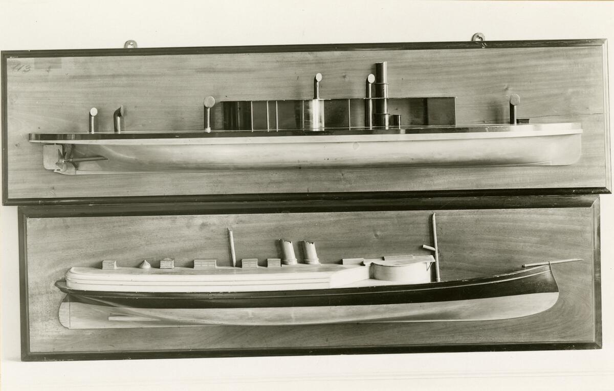 Marinmuseum på Strandvägen 58. Utställda halvmodeller av kanonbåt och monitor.